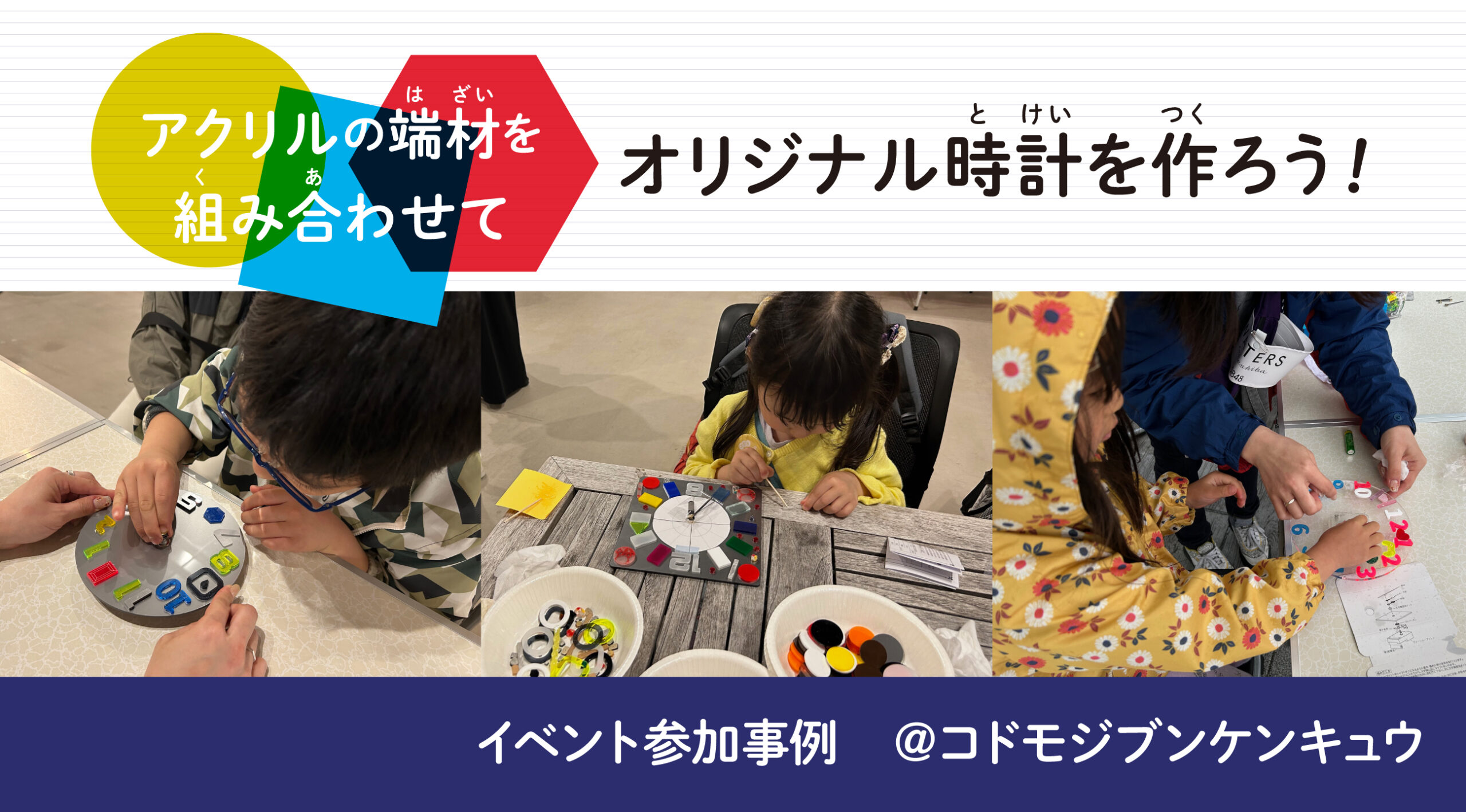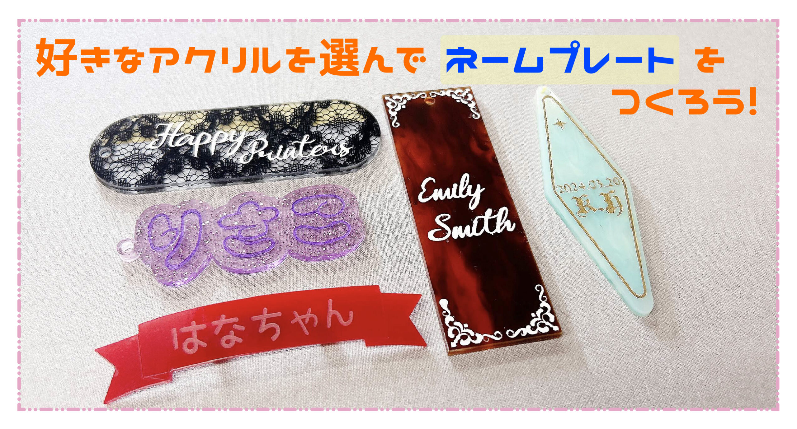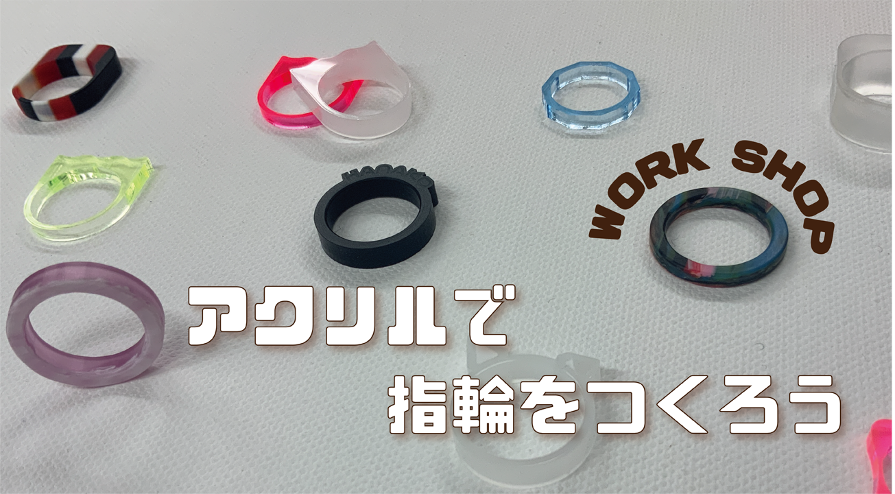 「アクリルで指輪をつくろう」「アクリルかんざしを作ろう」「アクリルキューブにプリントしよう」「お絵描きミラーチャームを作ろう」「壁掛け時計を作ろう」「エアリーピアスを作ろう」「パーツピアスを作ろう」「アクリルをねじってアクセサリーを作ろう」